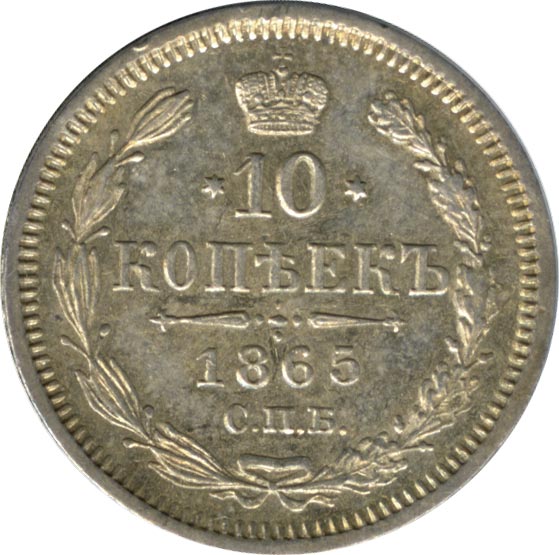 Лицевая сторона — гербовый орел, оборотная —обозначение номинала (10 копеекъ), окруженное венком из лавровой и дубовой ветвей и дата.