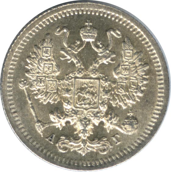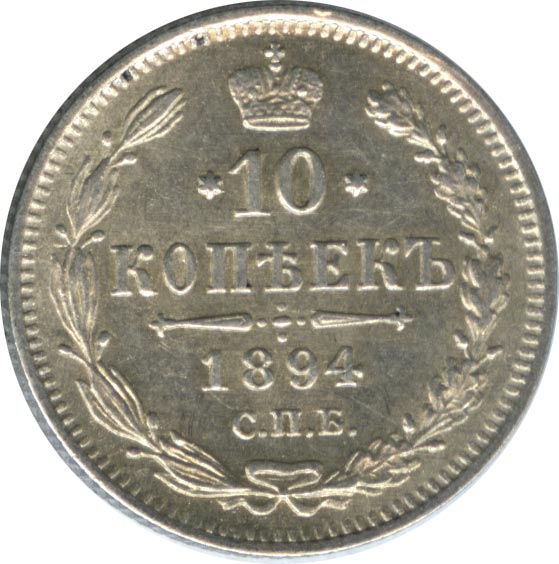 Лицевая сторона — гербовый орел, оборотная —обозначение номинала (10 копеекъ), окруженное венком из лавровой и дубовой ветвей и дата.