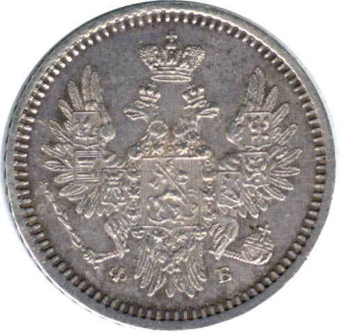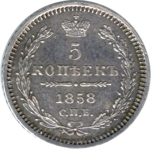 Лицевая сторона — новый гербовый орел с поднятыми крыльями, оборотная —обозначение номинала (5 копеекъ), окруженное венком из лавровой и дубовой ветвей и дата. Проба — 868, нормативный вес — 1,04 грамма.
