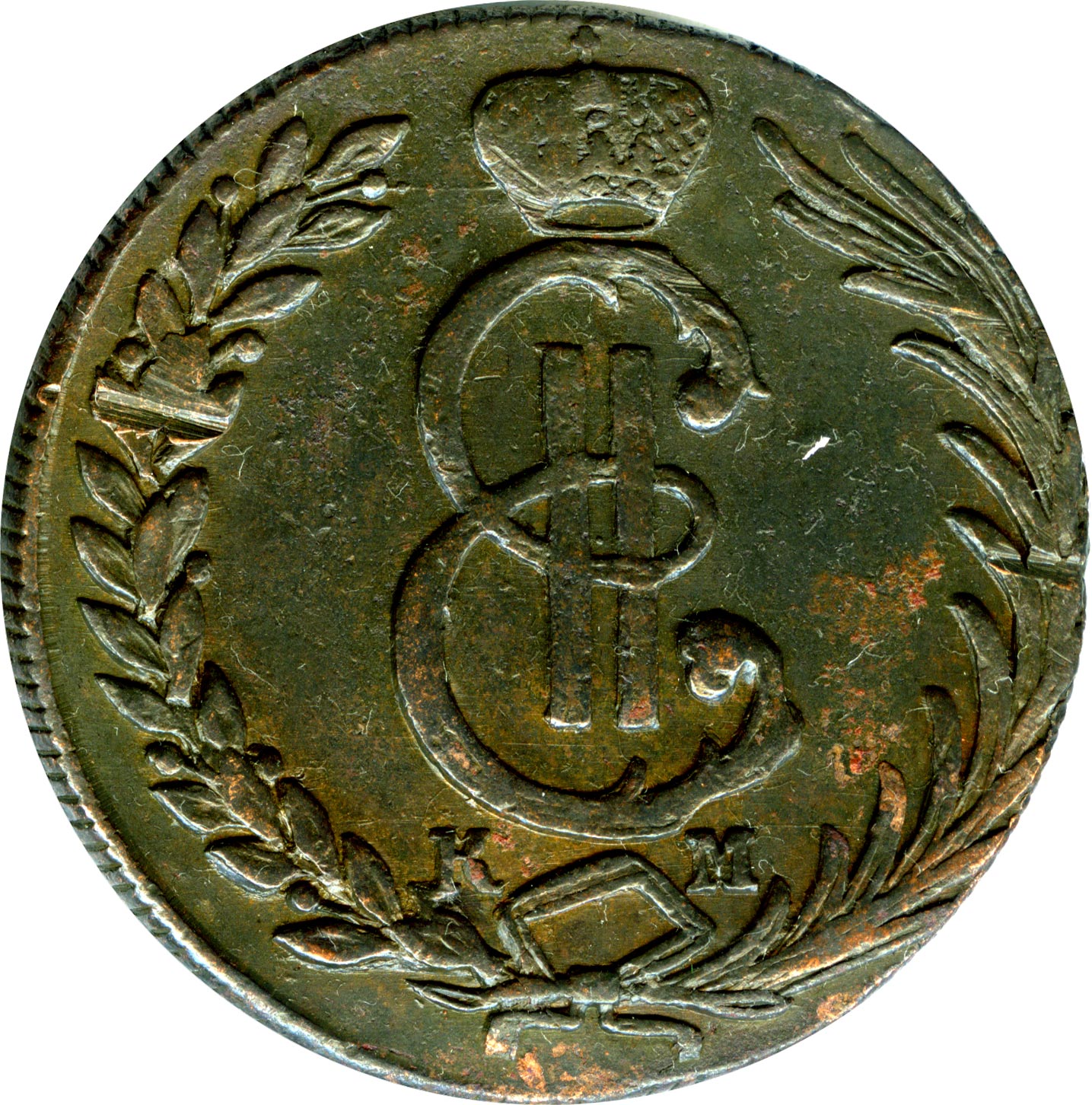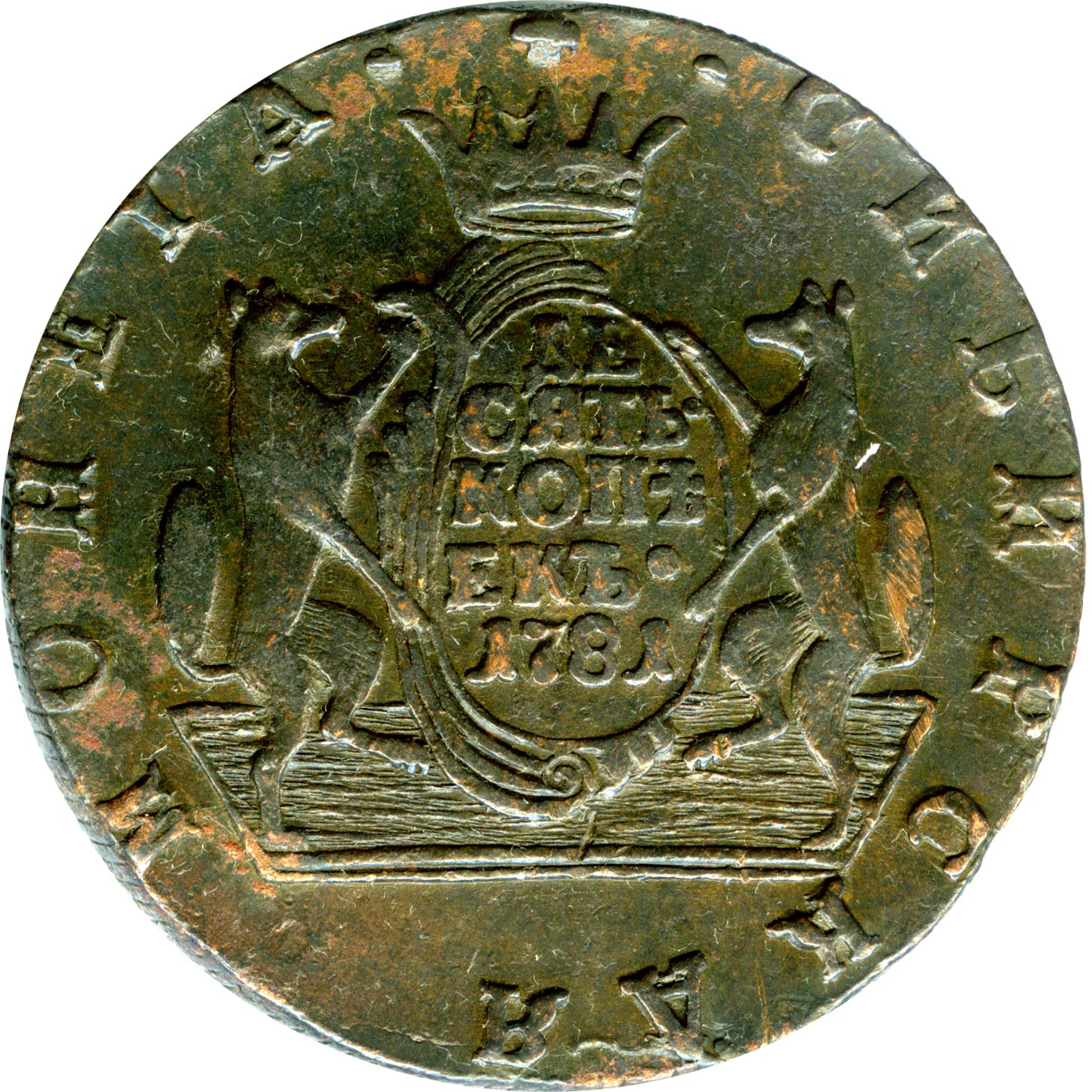 Лицевая сторона - два соболя поддерживают щит с обозначением номинала (десять копеекъ) под короной, надпись «СИБИРСКАЯ МОНЕТА». Оборотная — вензель Екатерины II в венке из пальмовой и лавровой ветвей. Вес — 65, 52 грамма. Нормативный вес — 65,52 грамма, это самая увесистая медная монета регулярного чекана в истории российской нумизматики. Гурт — надпись «колыванская медь» или шнур.