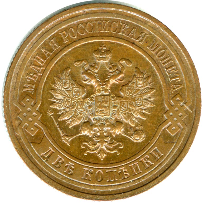 Лицевая сторона — двуглавый орел, надпись МЕДНАЯ РОССIЙСКАЯ МОНЕТА и обозначение номинала (две копейки); оборотная — обозначение номинала (2 копейки) в бусовом ободке и дата. Нормативный вес — 6,55 грамма, гурт рубчатый.