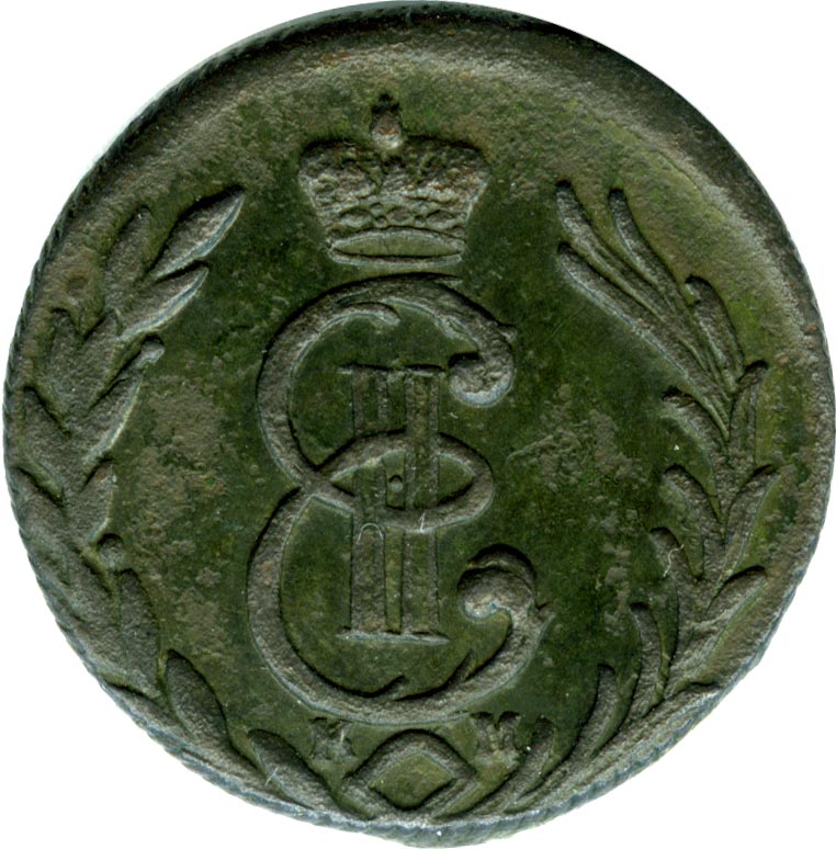 Лицевая сторона - два соболя поддерживают щит с обозначением номинала (копейка) под короной, надпись «СИБИРСКАЯ МОНЕТА». Оборотная — вензель Екатерины II в венке из пальмовой и лавровой ветвей. Гурт — шнур, вес — 6,55 грамма.