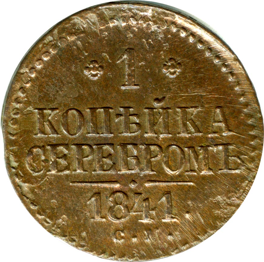 На новых монетах равенство серебряному курсу указано прямо в номинале: «1 КОПЕЙКА СЕРЕБРОМ». Указ об их выпуске следует 6 сентября 1840 года («О новой медной монете на серебро 16-рублевого в пуде достоинства»). Массовая чеканка началось за год до этого на Екатеринбургском (знак ЕМ) и Сузунском (знак СМ) дворах. В качестве временной меры в 1840-1843 годах к ним подключается Ижорский завод (знак СПМ). С 1844 года после «значительного скопления медной монеты в народном обращении» в Екатеринбурге производство прекращается, а в Сузуне сокращается.