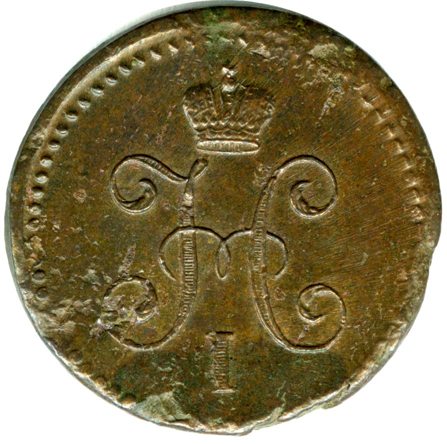 Лицевая сторона — вензель Николая I в бусовом ободке, оборотная — надпись «1 КОПЕЙКА СЕРЕБРОМ» и дата. Нормативный вес — 10,24 грамма, гурт гладкий.
