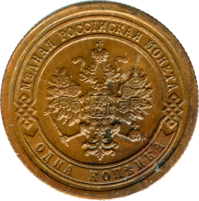 Лицевая сторона — двуглавый орел, надпись МЕДНАЯ РОССIЙСКАЯ МОНЕТА и обозначение номинала (одна копейка); оборотная — обозначение номинала (1 копейка) в бусовом ободке и дата. Нормативный вес — 3,28 грамма, гурт рубчатый.