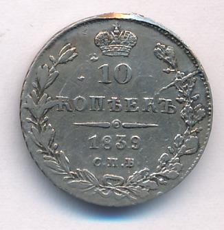 Лицевая сторона — новый гербовый орел с поднятыми крыльями, оборотная —обозначение номинала (10 копеекъ), окруженное венком из лавровой и дубовой ветвей и дата. Проба — 868, нормативный вес — 2,07 грамма.