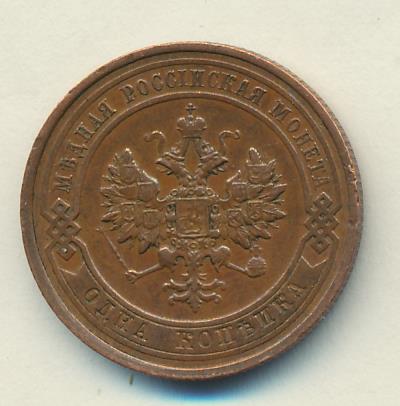 Лицевая сторона — двуглавый орел, надпись МЕДНАЯ РОССIЙСКАЯ МОНЕТА и обозначение номинала (одна копейка); оборотная — обозначение номинала (1 копейка) в бусовом ободке и дата. Нормативный вес — 3,28 грамма, гурт рубчатый.