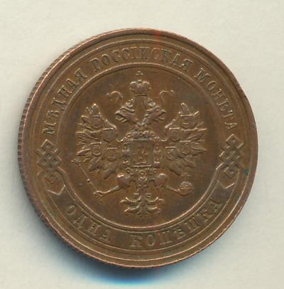 Лицевая сторона — двуглавый орел, надпись МЕДНАЯ РОССIЙСКАЯ МОНЕТА и обозначение номинала (одна копейка); оборотная — обозначение номинала (1 копейка) в бусовом ободке и дата. Нормативный вес — 3,28 грамма, гурт рубчатый.