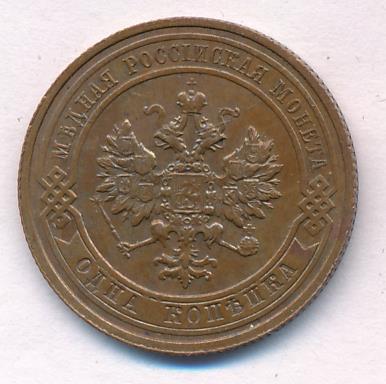 Лицевая сторона — двуглавый орел, надпись МЕДНАЯ РОССIЙСКАЯ МОНЕТА и обозначение номинала (одна копейка); оборотная — обозначение номинала (1 копейка) в бусовом ободке и дата. Нормативный вес — 3,28 грамма, гурт рубчатый.