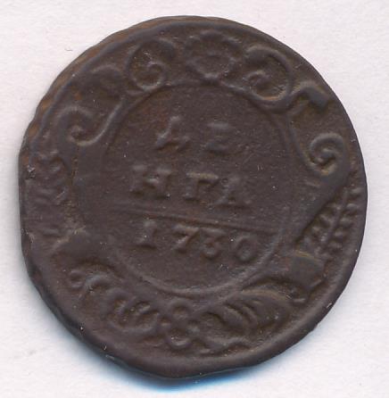 С 1730 года, как и 30 лет назад, медь возвращает себе статус разменных долей серебряной копейки — печатаются только денги и полушки. Указ от 22 декабря 1730 года регламентирует их выпуск на 10 рублей из пуда меди. Петровские копейки 20-рублевой стопы перечеканиваются в денги, а копейки Петра II 40-рублевой стопы — в полушки.