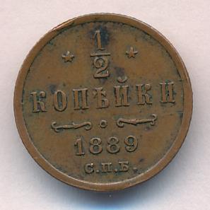 Лицевая сторона — вензель Александра II в венке из лавровой и дубовой ветвей; оборотная — обозначение номинала (1/2 копейки) и дата. Нормативный вес — 1,64 грамма, гурт рубчатый.