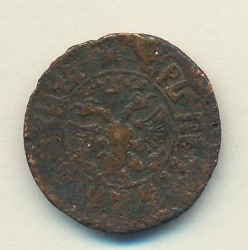 На лицевой стороне — гербовый орел и надпись «царь петр алексеевич», на оборотной - «всея россии самодержец» и обозначение номинала (полушка).