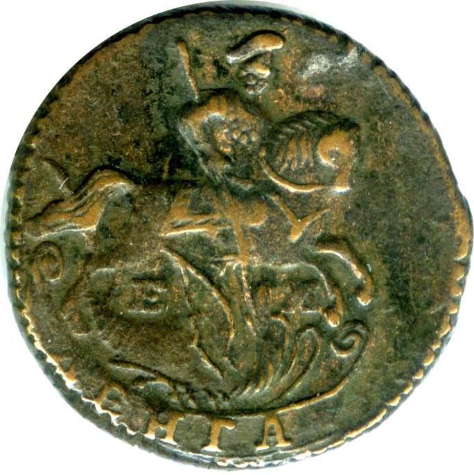 Лицевая сторона — Георгий Победоносец и обозначение номинала (денга) в картуше, оборотная — вензель Екатерины II и дата. Нормативный вес — 5,12 грамма, гурт рубчатый или шнур.