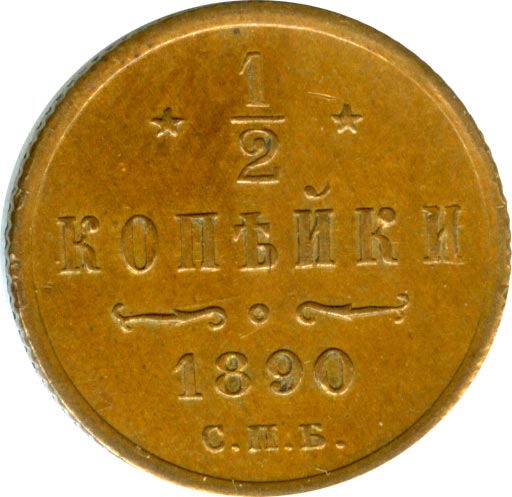 Лицевая сторона — вензель Александра II в венке из лавровой и дубовой ветвей; оборотная — обозначение номинала (1/2 копейки) и дата. Нормативный вес — 1,64 грамма, гурт рубчатый.