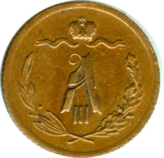 Указом от 21 марта 1867 года Александр II утверждает 50-рублевую стопу для медных монет. Новые монеты получают усложненное оформление, дополнительным отличием от прежних выпусков служит рубчатый гурт (чеканка ведется без предварительного гурчения кружков в неразъемном рубчатом кольце).