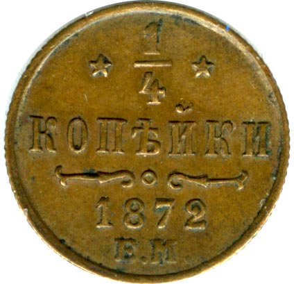 Лицевая сторона — вензель Александра II в венке из лавровой и дубовой ветвей; оборотная — обозначение номинала (1/4 копейки) и дата. Нормативный вес — 0,82 грамма, гурт рубчатый.