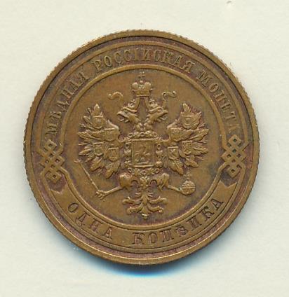 Лицевая сторона — двуглавый орел, надпись МЕДНАЯ РОССIЙСКАЯ МОНЕТА и обозначение номинала (одна копейка); оборотная — обозначение номинала (1 копейка) в бусовом ободке и дата. Нормативный вес — 3,28 грамма, гурт рубчатый.