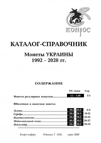 Особенности: Каталог легко и доступно ориентирует на рынке юбилейки Украины. Представленные в справочнике цены на монеты являются среднерыночными, это результат постоянного мониторинга авторами всех рыночных площадок. Редакция 7 пополнилась сотней новинок от Банка Украины, дополнен и уточнен план выпуска на 2020 год. Также, полностью представлен теперь в справочнике и раздел Регулярного чекана, от 10 гривен до 5 копеек, внесены более сотни разновидностей, чеканившихся с 1992 года, есть и позиции R на этих страницах. А5 формат, 56 стр., печать монохромная, офсет
