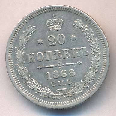 Лицевая сторона — гербовый орел, оборотная —обозначение номинала (20 копеекъ), окруженное венком из лавровой и дубовой ветвей и дата.