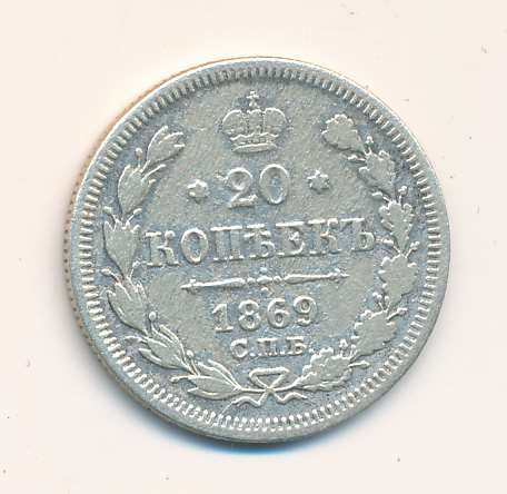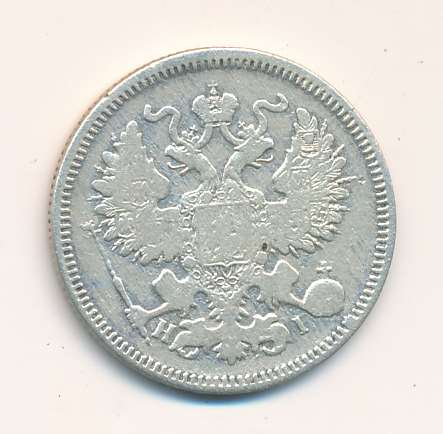 Лицевая сторона — гербовый орел, оборотная —обозначение номинала (20 копеекъ), окруженное венком из лавровой и дубовой ветвей и дата.