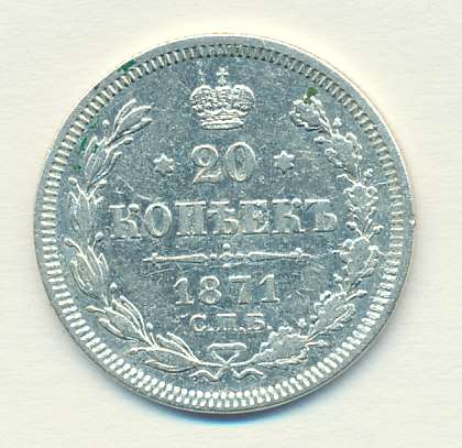 Лицевая сторона — гербовый орел, оборотная —обозначение номинала (20 копеекъ), окруженное венком из лавровой и дубовой ветвей и дата.