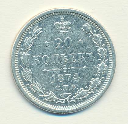 Лицевая сторона — гербовый орел, оборотная —обозначение номинала (20 копеекъ), окруженное венком из лавровой и дубовой ветвей и дата.