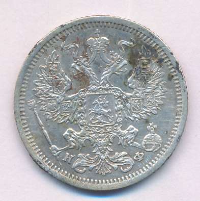 Лицевая сторона — гербовый орел, оборотная —обозначение номинала (20 копеекъ), окруженное венком из лавровой и дубовой ветвей и дата.