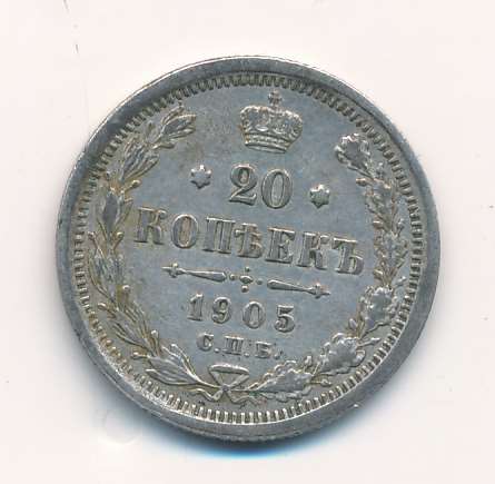 Лицевая сторона — гербовый орел, оборотная —обозначение номинала (20 копеекъ), окруженное венком из лавровой и дубовой ветвей и дата.