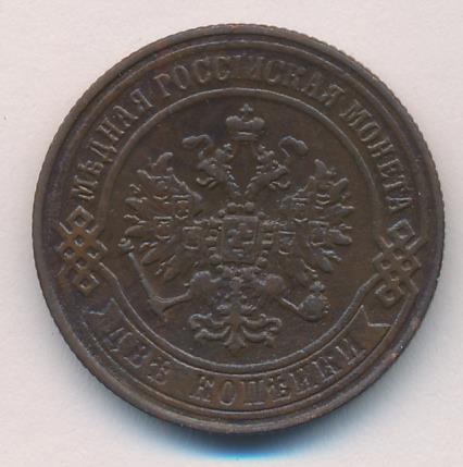 Лицевая сторона — двуглавый орел, надпись МЕДНАЯ РОССIЙСКАЯ МОНЕТА и обозначение номинала (две копейки); оборотная — обозначение номинала (2 копейки) в бусовом ободке и дата. Нормативный вес — 6,55 грамма, гурт рубчатый.