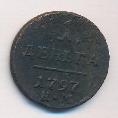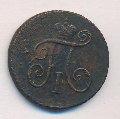 Лицевая сторона — вензель Павла I под короной, оборотная — номинал (1 деньга) и дата. Нормативный вес — 5,12 грамма, гурт — шнур.