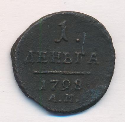 Лицевая сторона — вензель Павла I под короной, оборотная — номинал (1 деньга) и дата. Нормативный вес — 5,12 грамма, гурт — шнур.