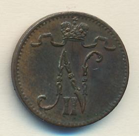 Лицевая сторона — вензель Александра II, оборотная — номинал (1 PENNIA) и дата. Нормативный вес — 1,28 грамма, гурт гладкий.
