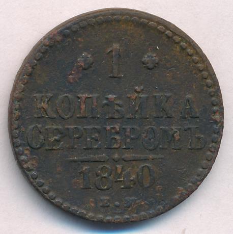 На новых монетах равенство серебряному курсу указано прямо в номинале: «1 КОПЕЙКА СЕРЕБРОМ». Указ об их выпуске следует 6 сентября 1840 года («О новой медной монете на серебро 16-рублевого в пуде достоинства»). Массовая чеканка началось за год до этого на Екатеринбургском (знак ЕМ) и Сузунском (знак СМ) дворах. В качестве временной меры в 1840-1843 годах к ним подключается Ижорский завод (знак СПМ). С 1844 года после «значительного скопления медной монеты в народном обращении» в Екатеринбурге производство прекращается, а в Сузуне сокращается.