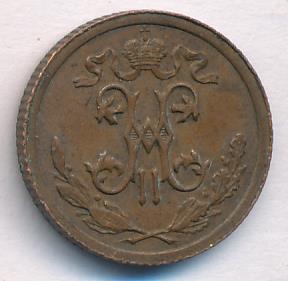 Лицевая сторона — вензель Александра II в венке из лавровой и дубовой ветвей; оборотная — обозначение номинала (1/2 копейки) и дата. Нормативный вес — 1,64 грамма, гурт рубчатый.