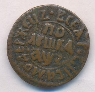 На лицевой стороне — гербовый орел и надпись «царь петр алексеевич», на оборотной - «всея россии самодержец» и обозначение номинала (полушка).