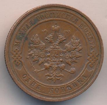 Лицевая сторона — двуглавый орел, надпись МЕДНАЯ РОССIЙСКАЯ МОНЕТА и обозначение номинала (одна копейка); оборотная — обозначение номинала (1 копейка) в бусовом ободке и дата. Нормативный вес — 3,28 грамма, гурт рубчатый.