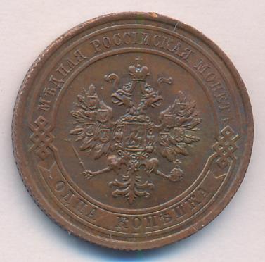 Лицевая сторона — двуглавый орел, надпись МЕДНАЯ РОССIЙСКАЯ МОНЕТА и обозначение номинала (одна копейка); оборотная — обозначение номинала (1 копейка) в бусовом ободке и дата. Нормативный вес — 3,28 грамма, гурт рубчатый.