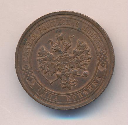 Лицевая сторона — двуглавый орел, надпись МЕДНАЯ РОССIЙСКАЯ МОНЕТА и обозначение номинала (одна копейка); оборотная — обозначение номинала (1 копейка) в бусовом ободке и дата. Нормативный вес — 3,28 грамма, гурт рубчатый.