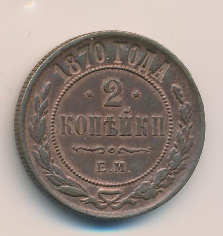 Лицевая сторона — двуглавый орел, надпись МЕДНАЯ РОССIЙСКАЯ МОНЕТА и обозначение номинала (две копейки); оборотная — обозначение номинала (2 копейки) в бусовом ободке и дата. Нормативный вес — 6,55 грамма, гурт рубчатый.