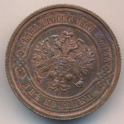 Лицевая сторона — двуглавый орел, надпись МЕДНАЯ РОССIЙСКАЯ МОНЕТА и обозначение номинала (две копейки); оборотная — обозначение номинала (2 копейки) в бусовом ободке и дата. Нормативный вес — 6,55 грамма, гурт рубчатый.