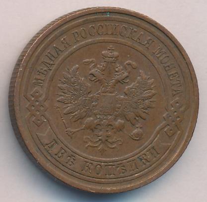 Лицевая сторона — двуглавый орел, надпись МЕДНАЯ РОССIЙСКАЯ МОНЕТА и обозначение номинала (две копейки); оборотная — обозначение номинала (2 копейки) в бусовом ободке и дата. Нормативный вес — 6,55 грамма, гурт рубчатый.