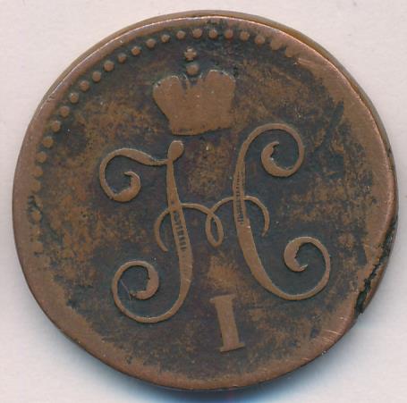 Лицевая сторона — вензель Николая I в бусовом ободке, оборотная — надпись «1 КОПЕЙКА СЕРЕБРОМ» и дата. Нормативный вес — 10,24 грамма, гурт гладкий.