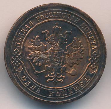 Лицевая сторона — двуглавый орел, надпись МЕДНАЯ РОССIЙСКАЯ МОНЕТА и обозначение номинала (одна копейка); оборотная — обозначение номинала (1 копейка) в бусовом ободке и дата. Нормативный вес — 3,28 грамма, гурт рубчатый.