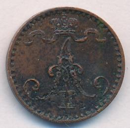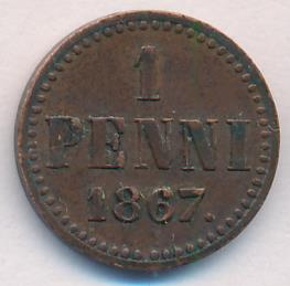 Лицевая сторона — вензель Александра II, оборотная — номинал (1 PENNIA) и дата. Нормативный вес — 1,28 грамма, гурт гладкий.