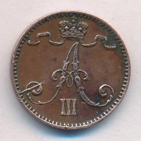 Лицевая сторона — вензель Александра II, оборотная — номинал (1 PENNIA) и дата. Нормативный вес — 1,28 грамма, гурт гладкий.