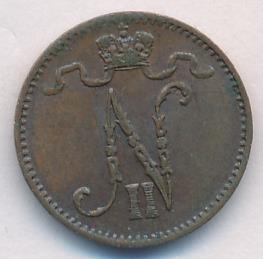Лицевая сторона — вензель Александра II, оборотная — номинал (1 PENNIA) и дата. Нормативный вес — 1,28 грамма, гурт гладкий.