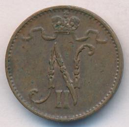 Лицевая сторона — вензель Александра II, оборотная — номинал (1 PENNIA) и дата. Нормативный вес — 1,28 грамма, гурт гладкий.