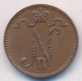 Лицевая сторона — вензель Александра II, оборотная — номинал (1 PENNIA) и дата. Нормативный вес — 1,28 грамма, гурт гладкий.