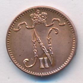Лицевая сторона — вензель Александра II, оборотная — номинал (1 PENNIA) и дата. Нормативный вес — 1,28 грамма, гурт гладкий.