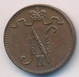 Лицевая сторона — вензель Александра II, оборотная — номинал (1 PENNIA) и дата. Нормативный вес — 1,28 грамма, гурт гладкий.